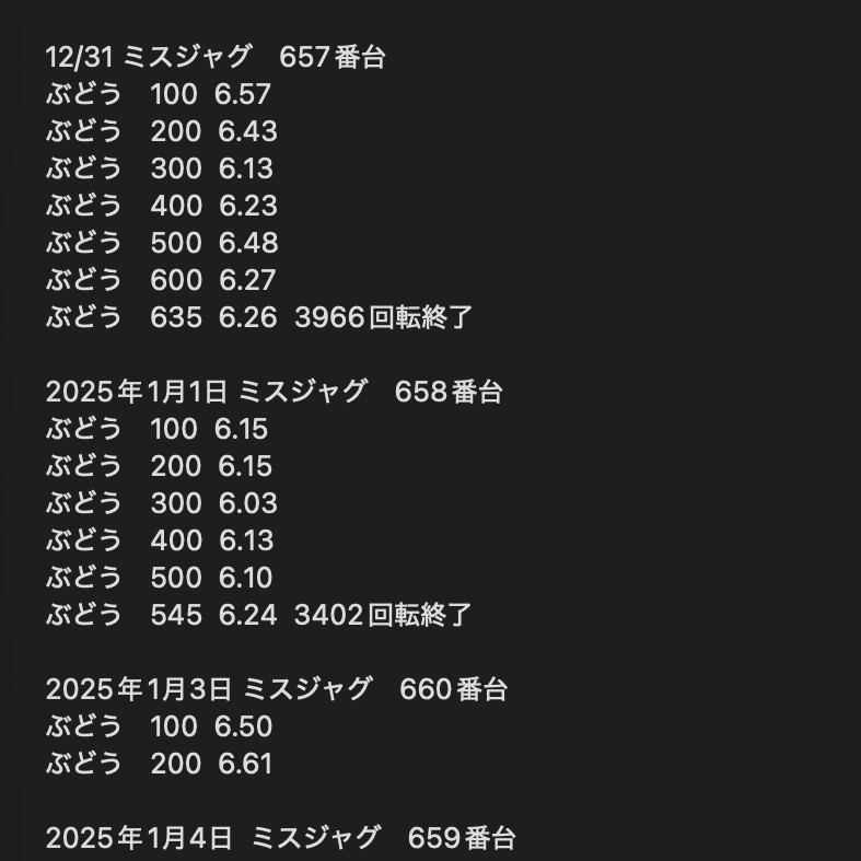 私がやっていたのは、1000ゲームごとにブドウ確率と大当たり確率をスマホのメモ機能に記録していくという方法です。